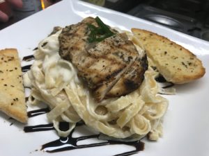 Today we will have a grilled chicken fettuccini Alfredo with balsamic reduction garnish with garlic bread and a side salad for $14.95. We will run this from 12:00 pm until 6:00.